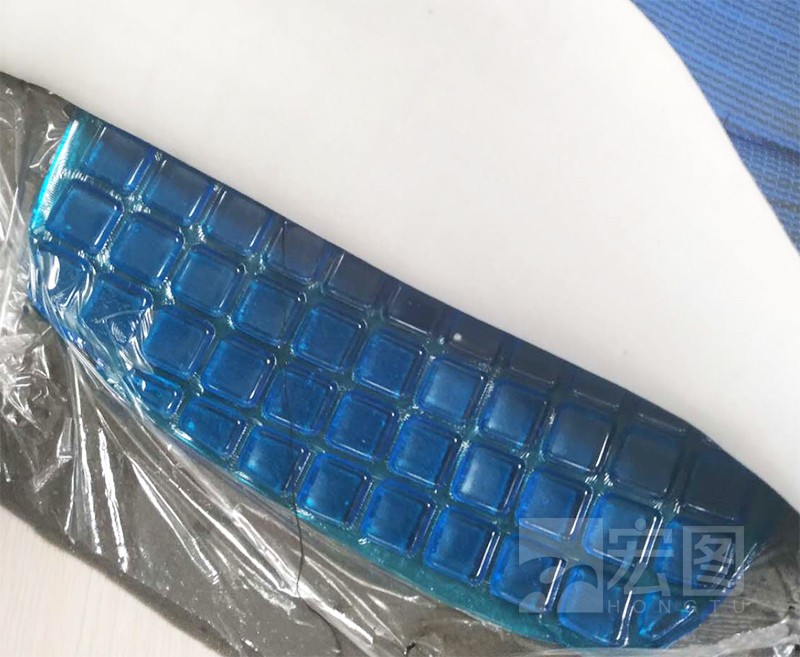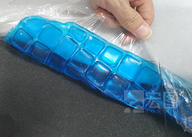 客戶坐墊模具,然后將1:1配比混合攪拌抽真空后液體硅凝膠倒入模具中,讓其加溫或者自然成型,在倒入硅凝膠前需要加入一張薄膜,硅膠硫化后表面也需要加入薄膜防止硅凝膠與海綿或者其他物質發生吸附。硫化后硅凝膠非常柔軟,手感類似果凍。